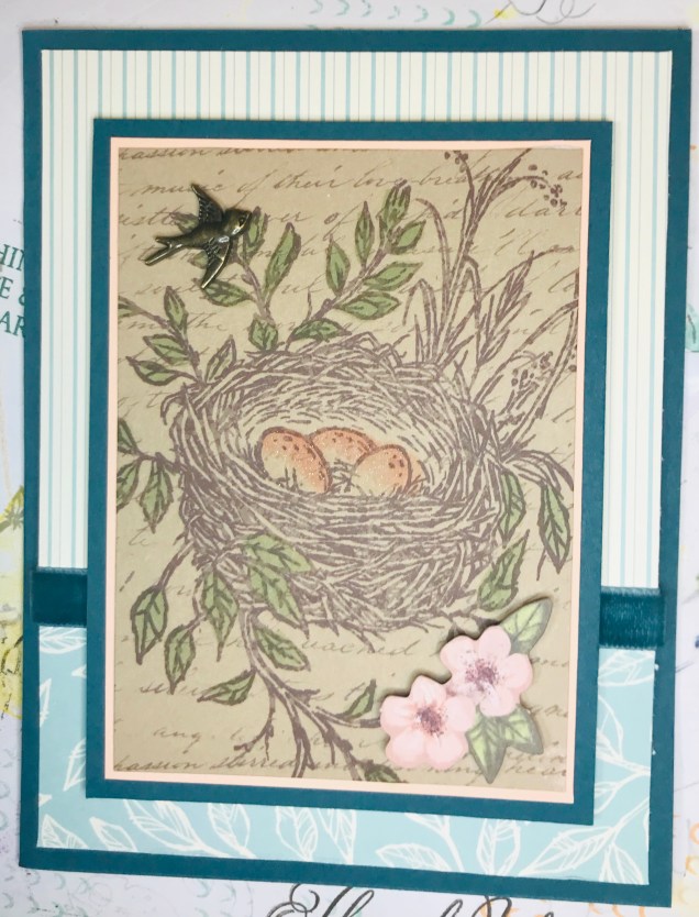 On the second card, I used the inner part of the kit’s envelopes as DSP. I used the card front with the nest as a focal point. I colored in the eggs and leaves to draw the eye to the nest itself. You probably can’t see it in the picture, but I brushed a little Wink of Stella across the tops of the eggs to make them sparkle. Aside from the sentiment on the inside, this card didn’t require any stamping.