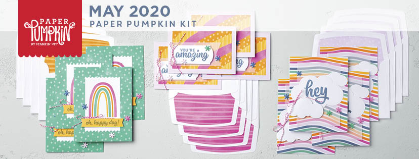 The May 2020 Paper Pumpkin is vibrant and playful. It comes with all of the supplies you need to make the three card designs pictured above (four of each design), a Misty Moonlight Stampin’ Spot, and the photopolymer stamp set pictured below.
