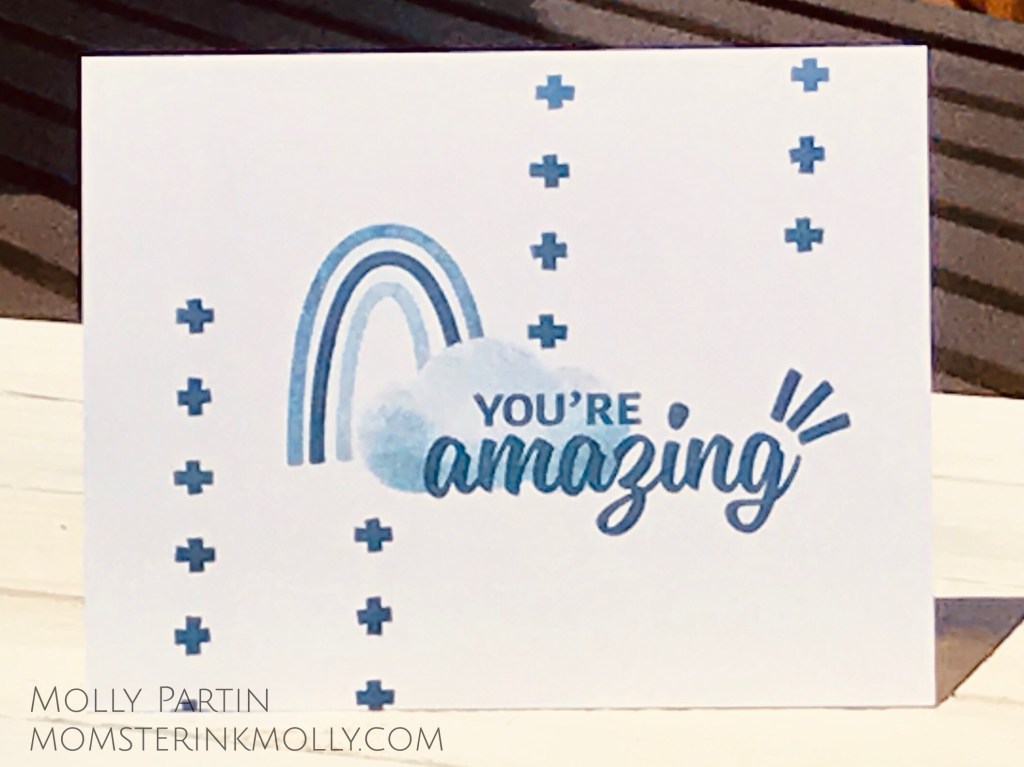 For my next card, I challenged myself to use only the kit’s stamp set and included ink pad to create a card on a single white card base. This card required several different stamping techniques including, masking, sponging, and stamping off.