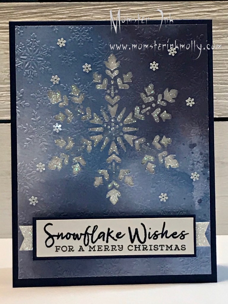 I embossed a piece of the blue watercolor-looking paper from the Snowflake Splendor designer series paper pack with the Winter Snow embossing folder. I just love the texture it provides! I used white glitter paper from my stash of retired products and placed it behind the snowflake cutout. The card was fairly simple and very satisfying to make.