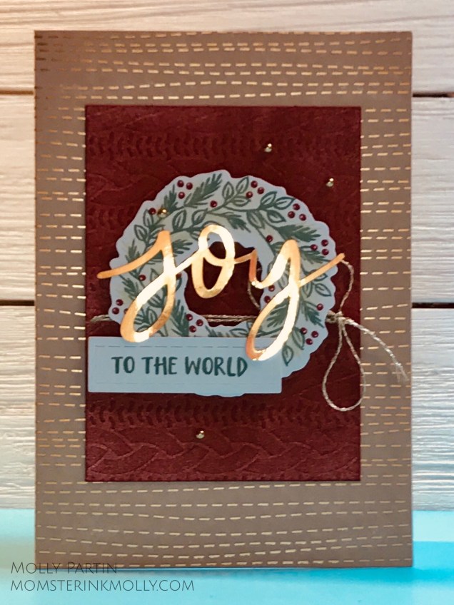 On this card, I cut down the front of one of the card bases and mounted it on a piece of Whisper White cardstock. I also sponge-rolled Cherry Cobbler ink on the cable-knit sweater embossed swatch of paper. Sponging on a different color of ink made the embossed pattern more prominent. Once again, I used gold thread instead of Cherry Cobbler.