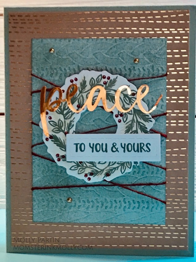 Can you tell I really liked sponge-rolling the cable-knit sweater pieces? This time I used Just Jade instead of Cherry Cobbler. I cut down the Crumb Cake card base and mounted it on a Just Jade card base. If you’ve ever made cards with me, you know that tying bows is not high on my list of paper-crafting skills. I wrapped the embossed paper with the Cherry Cobbler thread instead. I also added gold metallic pearls.